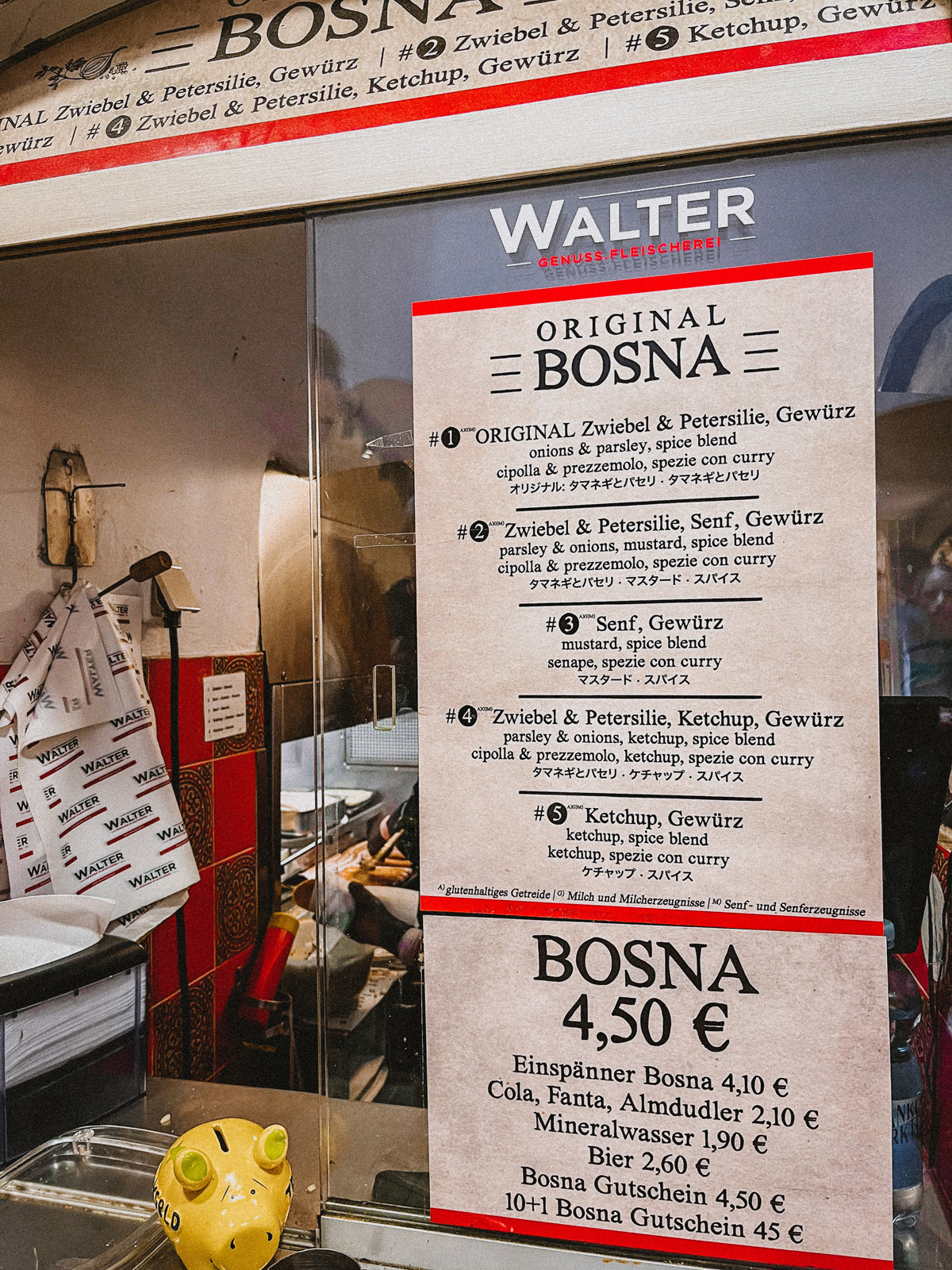 Du fragst dich, was Bosna sein sollen? Dabei handelt es sich um Bratwürste, die mit Zwiebeln, Petersilie und Gewürzen in leicht angebackenem Weißbrotwecken serviert werden. Die in Salzburg erfundene Grillspezialität bekommst du am Balkan-Grill, der sich im Durchgang zwischen der Getreidegasse und dem Universitätsplatz befindet. Eines kann ich dir versprechen: Schlange stehen lohnt sich!