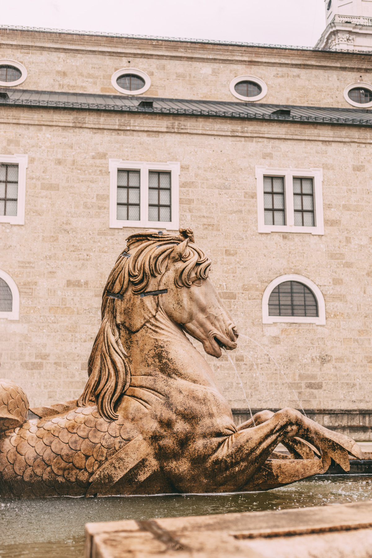 Die Salzburger Altstadt wird von wichtigen Plätzen durchzogen wie zum Beispiel dem Residenzplatz, der in den Mozartplatz übergeht. Hier sprudelt Wasser in einem verschnörkeltem Brunnen.